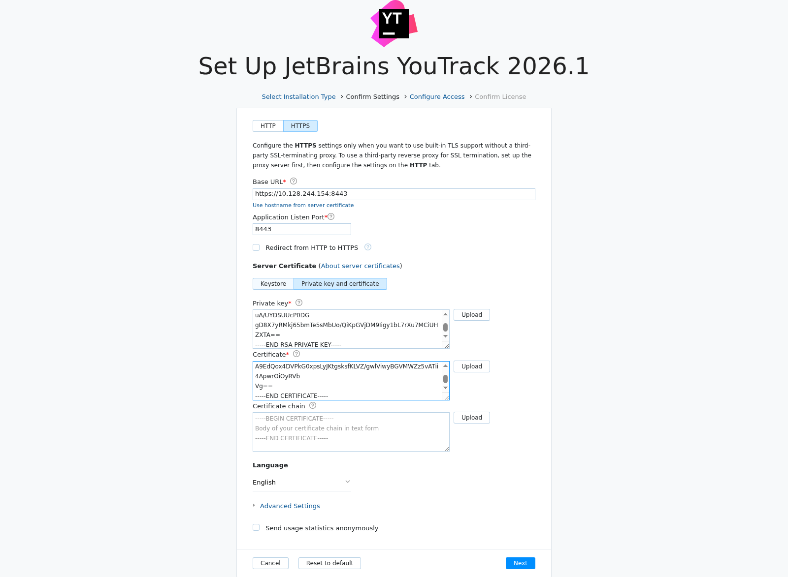 YouTrack_Server_TLS_cert.pemfile.Continue with the standard installation or upgrade. When done, traffic to your YouTrack server is secured using the self-signed certificate.