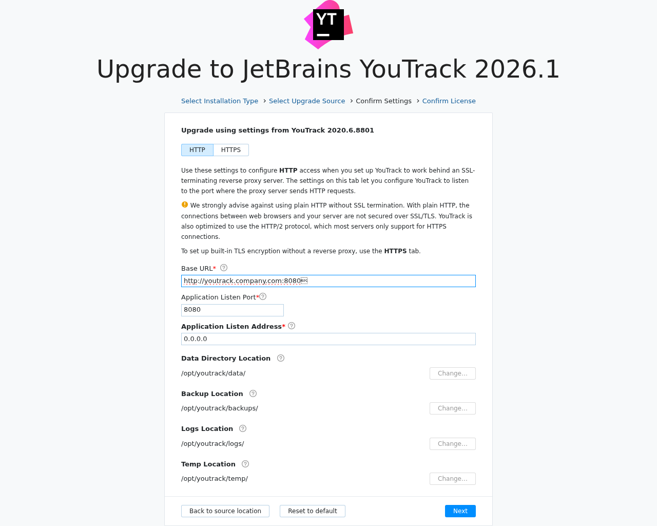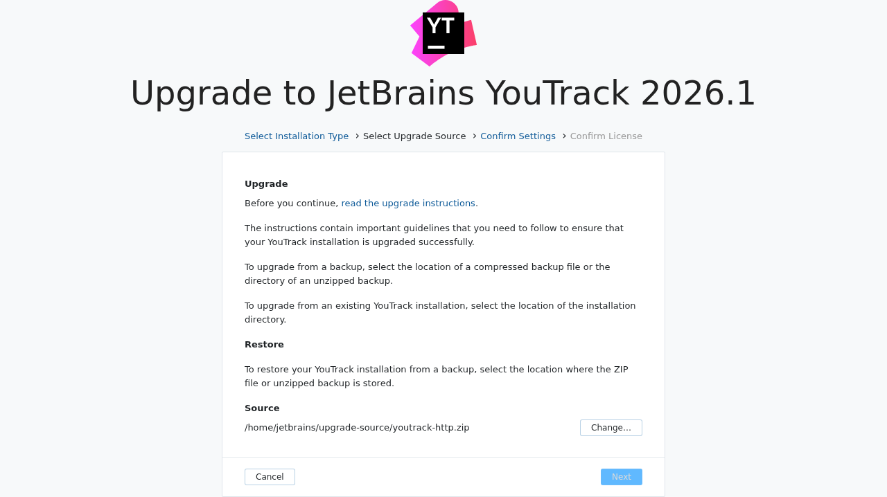 If all you want to do is upgrade your YouTrack installation from one version to another without changing any environmental variables, you can simply apply the update and skip the web-based Configuration Wizard.