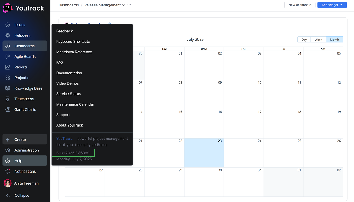 To locate the current version and build number for your YouTrack Server installation, open the Help menu in the main navigation.