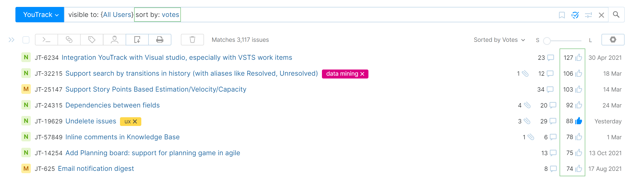 If you want to gauge the relative popularity of an issue, you can sort any list of issues by votes. Just add the following sort parameter to the search query:
