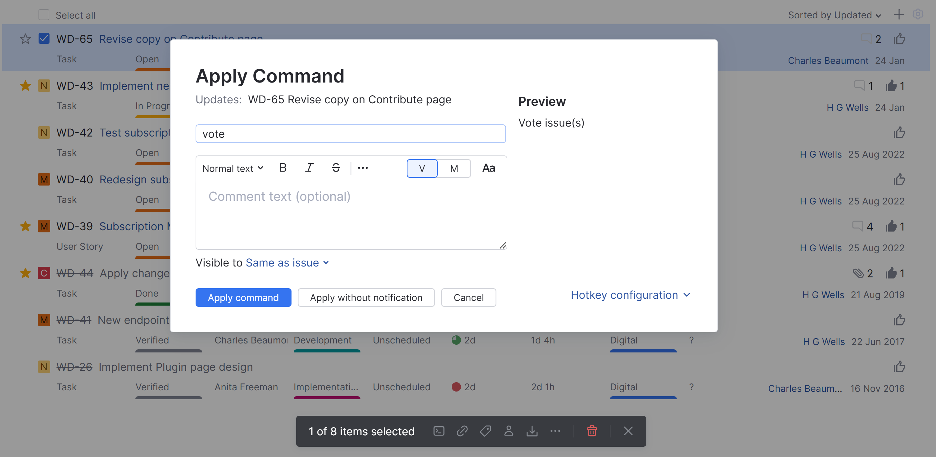If you have the View Voters permission in a project, you can view the list of users who have voted for an issue. The Voters list is only visible in single issue view. Click the List of voters counter next to the Vote icon.