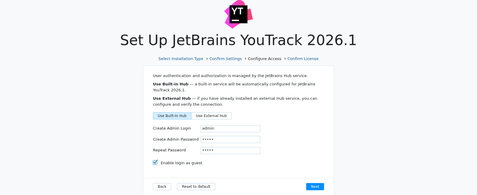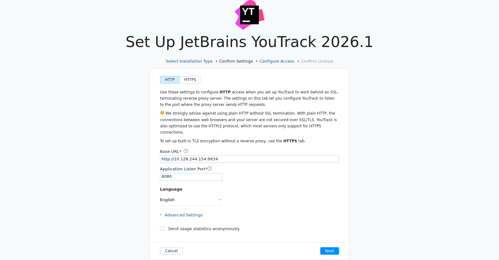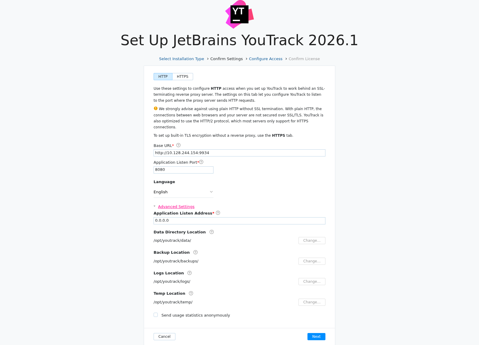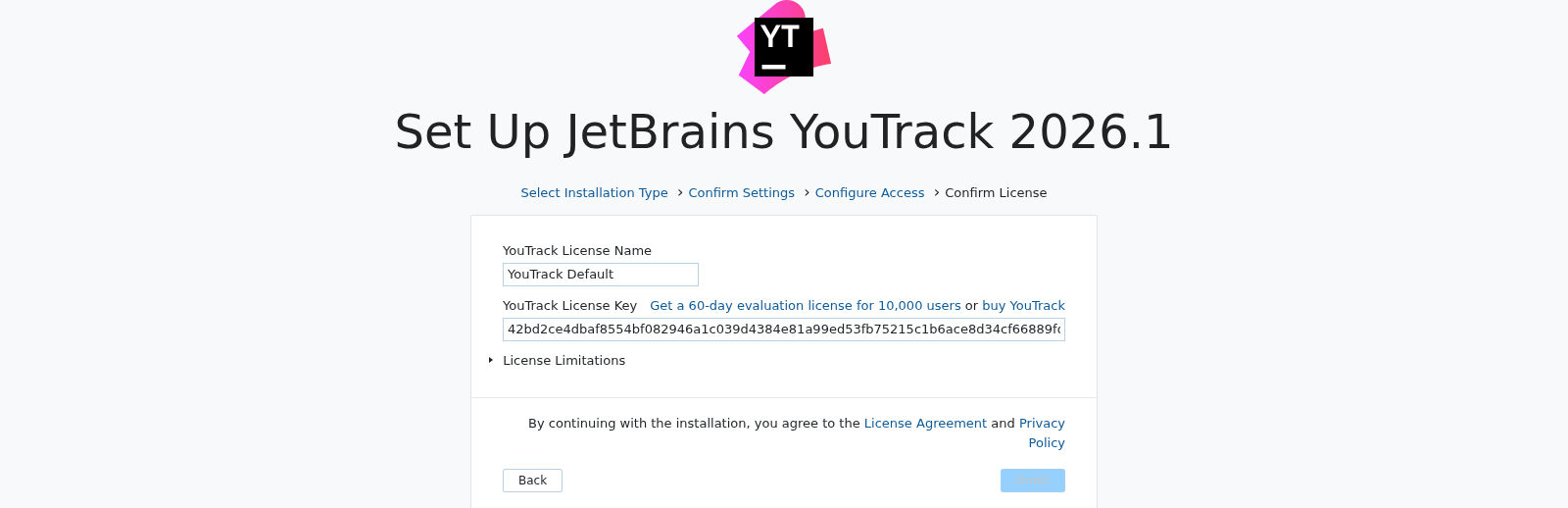 At this point, the application is installed with the default configuration. To ensure that YouTrack is set up properly to work in your server environment, you need to confirm and fine-tune its configuration.