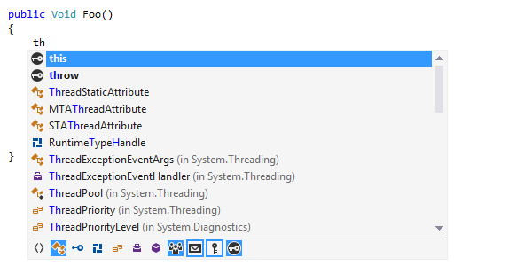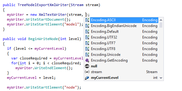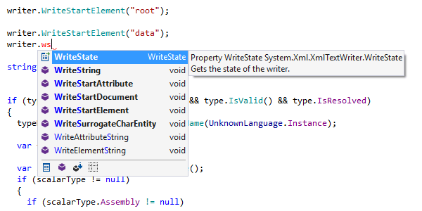 In C# code files, Import Symbol Completion works after dot with extension methods and puts necessary using directives. Import Symbol Completion is also very helpful in XAML markup for tag names. Namespace import directives are also inserted as required.