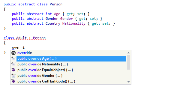 Ctrl+Space is, however, much more than that. It allows you also to quickly add symbol overrides, partial method bodies and partial classes, implement interface members and generate properties. ReSharper will generate and insert the whole body of method, constructor, property etc. when completing such items.