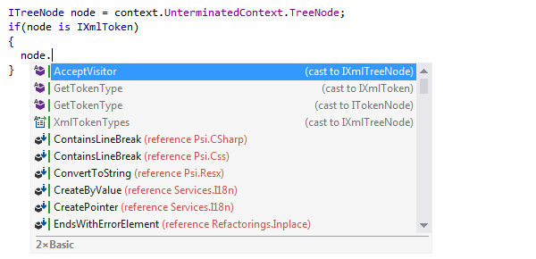 ReSharper will extend the completion list with protected, private and internal members, symbols from non-referenced assemblies, call chains that have return values of the expected data type, casts to the expected data type, and more. Of course, if you use any of the suggestions the missing imports and references are added automatically.