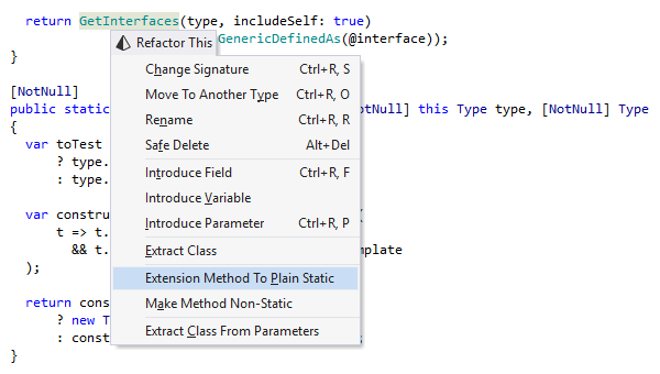 This refactoring converts a static method to an extension method. For the conversion to be carried out successfully, the static method must (1) have at least one argument and (2) reside in a static class. The reverse functionality is available with Convert Extension Method to Plain Static.