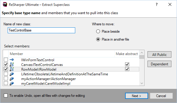 With this refactoring, you can create a base class for a class and move some members to it. Just place the caret at a class declaration, select members to extract, and run the refactoring. It is very useful for moving logic up an inheritance hierarchy so as to share it later.