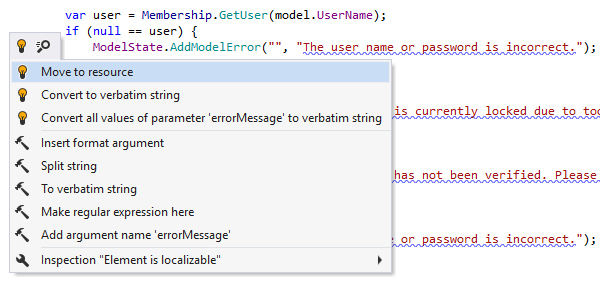 A part of ReSharper's internationalization feature pack, this refactoring helps extract localizable strings into resource files. During the refactoring, explicit string usages are replaced with references to resource wrappers.