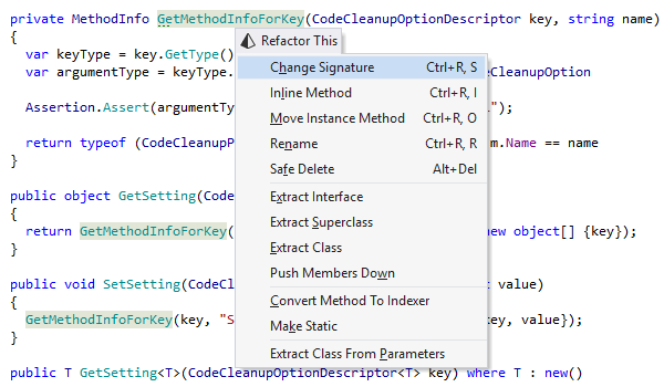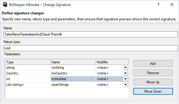 Along with changing the signature, ReSharper searches for all usages of the method and modifies all calls, implementations, and overrides of the method to reflect the change. In case of newly added parameters, default values for them supplied by the user are substituted in all method calls. In overrides, the original parameter passed to the method is passed to the base call.