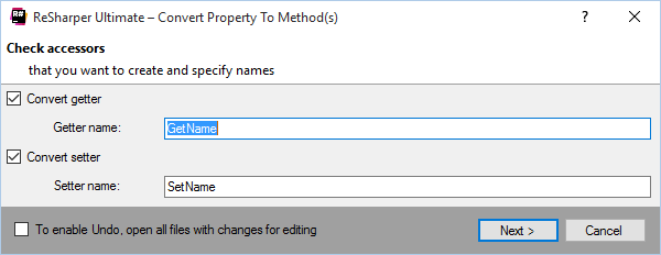 Using this refactoring, properties with read access can be converted to getter-type methods (non-void methods without parameters), and properties with write access can be converted to setter-type methods (void methods with exactly one parameter). As to properties allowing both read and write access, you can convert them to pairs of getter- and setter-type methods.