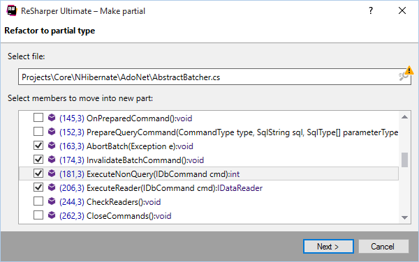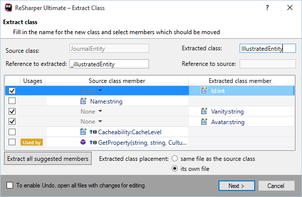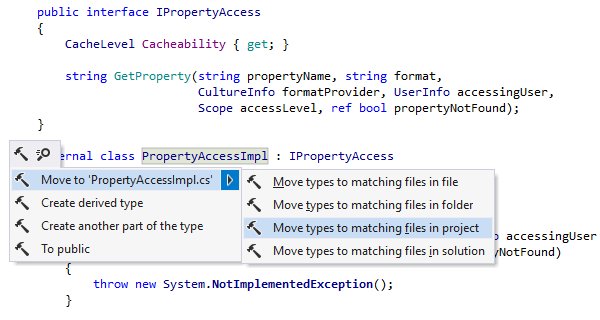 This refactoring helps you quickly move type members between different type parts of partial classes. Based on your input, the refactoring will use existing or create new type parts.