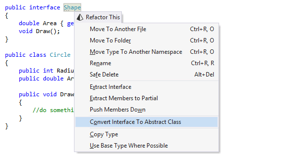After that, you invoke a required refactoring from the ReSharper's Refactor menu, or by using its individual keyboard shortcut. Alternatively, the Refactor This command — Ctrl+Shift+R — lets you see which refactorings can be applied at the current caret position or for the current selection.