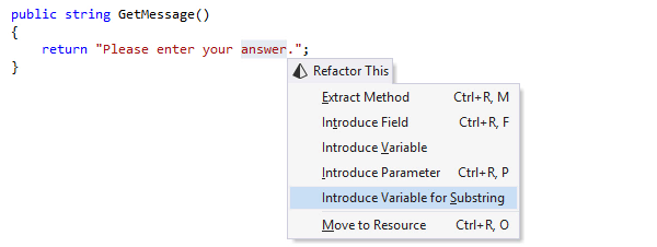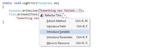 Select an arbitrary expression inside member code and invoke the Introduce Variable refactoring. A new implicitly or explicitly typed local variable will be declared and initialized with the selected expression. The original expression will be replaced with the name of the variable. Should there be multiple occurrences of the original expression in your code, you will be given an option to replace all of them with the newly created variable. In the same manner you may also introduce constants for constant expressions.