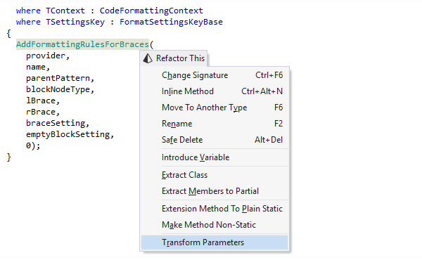 This refactoring creates a new class or struct and converts parameters of the selected method into encapsulated fields of the newly created type. Usages of parameters are converted into usages of properties of the type being created.