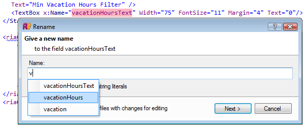 Automatic reference correction fully extends to XAML markup when you use the Rename refactoring. In addition, specific XAML symbols such as namespace aliases and resources can be renamed easily.