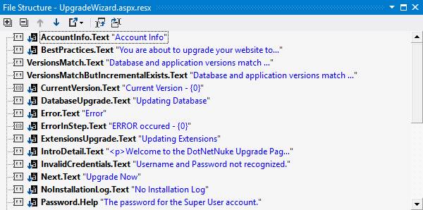ReSharper provides a specialized version of the File Structure tool window for viewing the structure of resource files. It lists all entries in a resource file, visualizing resource IDs, resource text in the current culture, and resource comments (if any). In addition, this tool window specifies whether resource entries are overridden in other cultures, and whether they contain format placeholders.