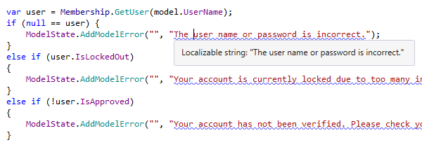ReSharper detects strings that you can localize, highlights them, and helps you move them to a resource file.