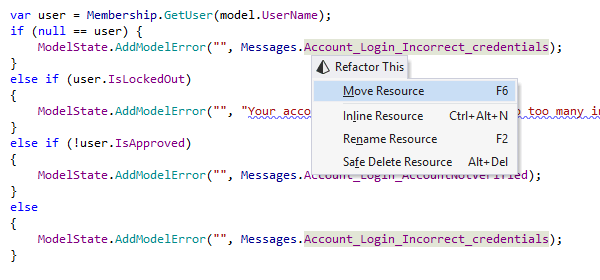 Depending on your project settings, strings that you can move to a resource file may or may not be highlighted with a curly underline. If a string is not highlighted, press Ctrl+Shift+R and select the Move to Resource refactoring. If a string is highlighted with a curly underline, as it is in the screenshot above, you can press Alt+Enter and launch the refactoring directly from the list of quick-fixes.