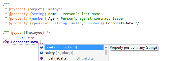 ReSharper makes JSDoc comments much easier to read by highlighting their syntax. When you type JSDoc comments, ReSharper helps you by completing your input. For example, you can type /** above a function and ReSharper will generate documentation stubs for all parameters and for the return value. JSDoc types, typedefs and callbacks are also properly highlighted and become available in code completion.