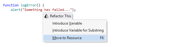There is also one refactoring specific to JavaScript/TypeScript: Move to Resource. This refactoring works in JavaScript/TypeScript projects created from Visual Studio templates (e.g. Apache Cordova) and allows moving string literals to resource files.