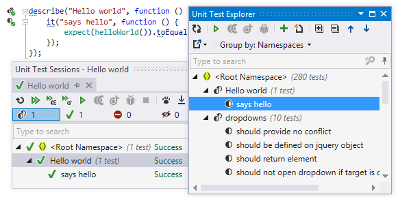 Similarly to .NET unit tests, you can browse JavaScript/TypeScript tests in your solution with Unit Test Explorer, run them from this window, from Solution Explorer or right from the editor, as well as use multiple unit test sessions.