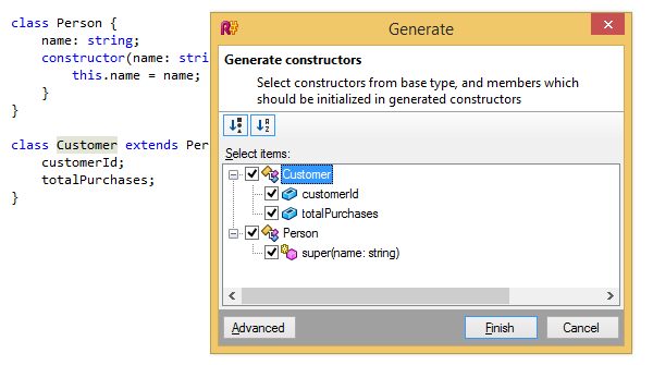 When you press Alt+Insert on a TypeScript type declaration, ReSharper lets you quickly create a constructor for this type. The constructor generation wizard creates a non-default constructor that takes selected fields from the type and base types as parameters.