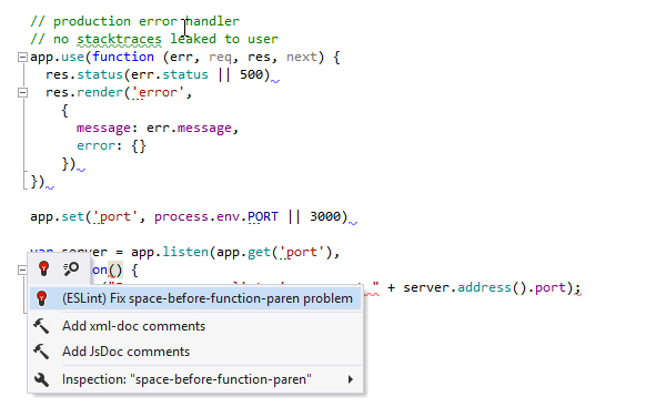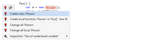 ReSharper's code analysis features help you quickly locate and correct errors and problems with about 100 code inspections for JavaScript and TypeScript code, and additionally about 50 TypeScript-specific inspections. Nearly all of the detected issues can be instantly fixed with quick-fixes.