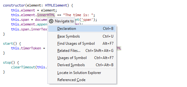 Most of ReSharper's navigation and search features are available in JavaScript and TypeScript. As usual, all commands for navigation from specific symbol are available with the Navigate To shortcut: Alt+`.