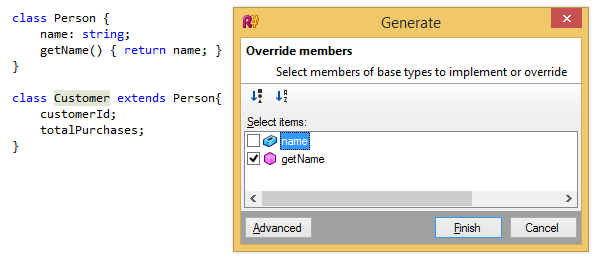 ReSharper comes with dozens of live templates that cover all frequently used code constructs in JavaScript and TypeScript. There are also postfix templates for TypeScript and JavaScript, and file templates for TypeScript classes, interfaces, and modules. You can extend the default set of templates with custom templates of your own.
