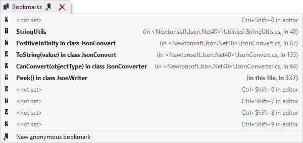 This is a simple yet powerful feature: you can drop a numbered marker with a single shortcut, and jump back at any time with another shortcut. You can create up to 10 numbered bookmarks, and unlimited unnumbered bookmarks. The full list of bookmarked locations is displayed in a single pop-up window to speed up navigation between code spots.