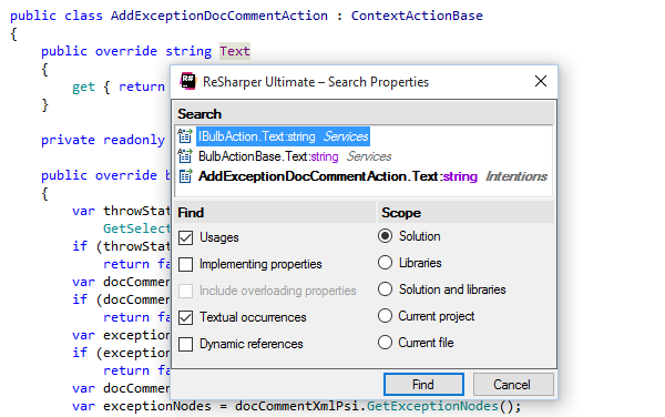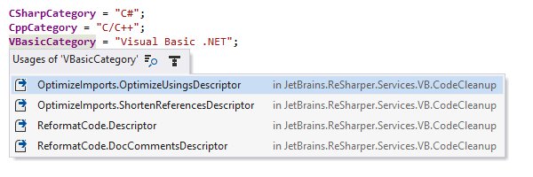 Find Usages quickly locates usages of any symbol (type, method, field, etc.) in your code. Just position the caret on the symbol for which you want to find usages and press Shift+F12. If you have a mixed-language project, usages can be found across multiple languages with ReSharper.
