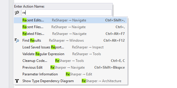 ReSharper helps you quickly find and apply any of its actions, without digging through its menu (by an action, we mean an executable command available for the current caret position or a command that opens a tool window). To find an action, just press Alt+Enter anywhere in the editor and start typing a command name or related words.