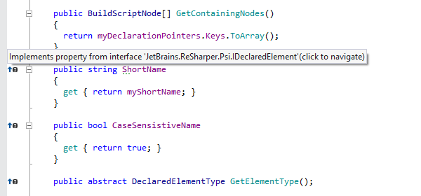 To navigate to the declaration of a symbol, position the caret at any symbol usage and press F12, or hold Ctrl and left-click the symbol. ReSharper will jump to the declaration of the corresponding type, method, field, or local variable in the relevant source file. For library symbols, the corresponding entity will be displayed in Visual Studio's Object Browser or in the editor as metadata view or decompiled code, depending on ReSharper settings.