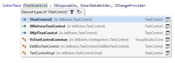 It works similar to Go to Derived Symbols but saves you time when you need to bypass one or more levels in a type hierarchy. Watch the GIF to see the difference.