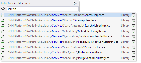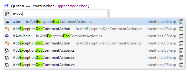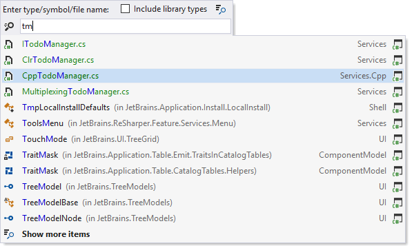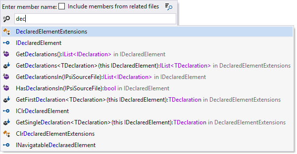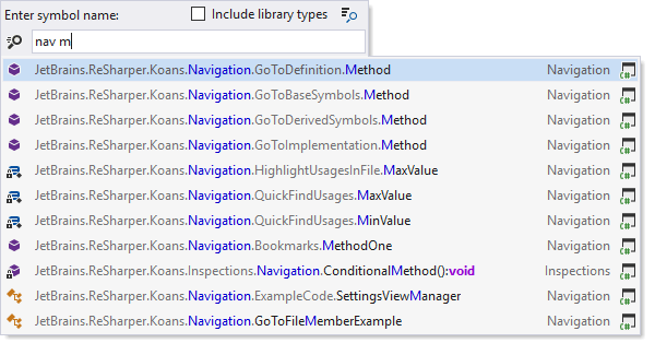 The Go to Symbol command searches for methods, fields and other file members by name, solution-wide. The command is available by pressing Shift+Alt+T. Note that all ReSharper's 'Go to' commands, including Go to Symbol, support case-insensitive CamelHumps. That is, you can find a member quicker by entering its initial character and any subsequent characters that its name contains — for example, you can find testFixedSizeBuffer by entering tfixs.