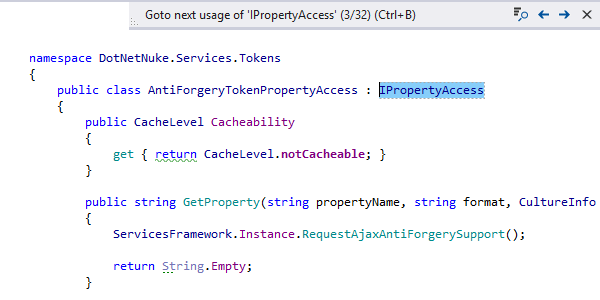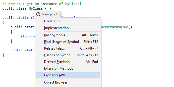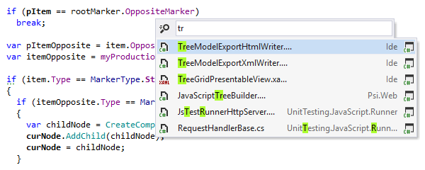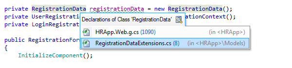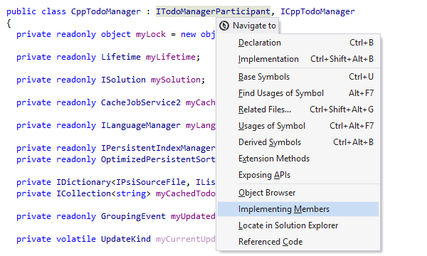 With ReSharper's navigation features, it's easy to traverse your entire solution. Jump to any file, type, or member in your code base, or navigate from a specific symbol to its usages, base and derived symbols, or implementations.