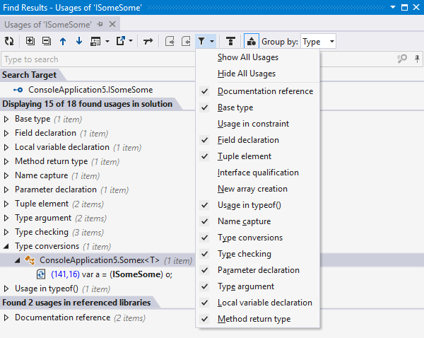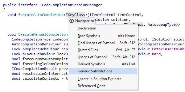 This command, available with the Navigate To shortcut, shows the list of all types that substitute a selected generic type parameter, as well as all code locations where each substitution is used.