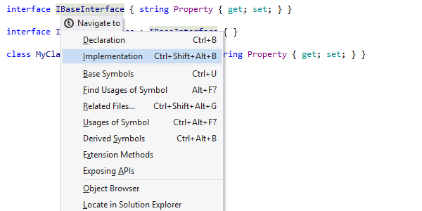 This navigation feature, available with Ctrl+F12 shortcut, lets you jump from a base type or member to any of its end implementations, bypassing intermediate steps in the inheritance chain.