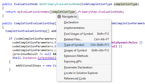 Press Ctrl+Shift+F11 to navigate to the declaration of a type that a variable, field, or parameter belongs to. ReSharper will switch to the declaration in source code or, for library types, display the corresponding symbol in the Object Browser or show decompiled code.