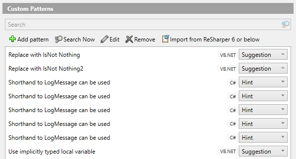 This feature lets you create patterns to search for code smells or legacy code that ReSharper doesn't detect out of the box, and replace them with good code. More than that, to make it easy to remove questionable code on a recurring basis, you can create custom code inspections and set up ReSharper to provide quick-fixes for them.