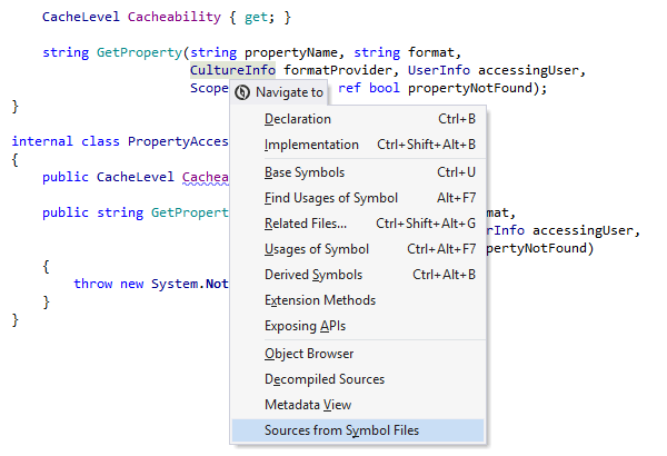 Some companies publish parts of their sources using the Source Server feature of debug information files (PDB). On the other hand, Microsoft uses this technology to provide access to the source code of the .NET Framework. If you have PDBs available and ReSharper installed, you can access sources stored that way as if they are a part of your solution. If you want to find out what a certain .NET Framework class contains, ReSharper will show it to you as well.
