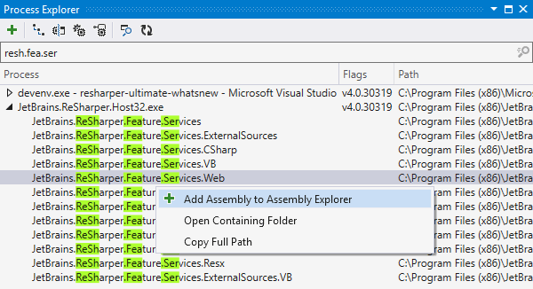 Filter the list to find a module or process that you're looking for, and then add its assemblies to Assembly Explorer for further investigation.