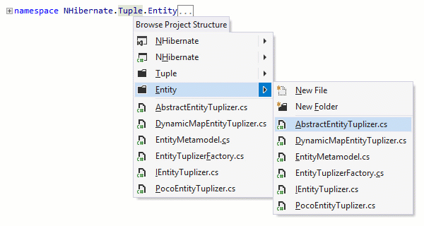 This feature, available with the Navigate To shortcut (Alt+`), helps you quickly navigate project structure around the current file. In the pop-up that opens, you can see the project where the current file belongs, folders and files at the same directory level, and you can easily jump to these files or create a new file or folder.