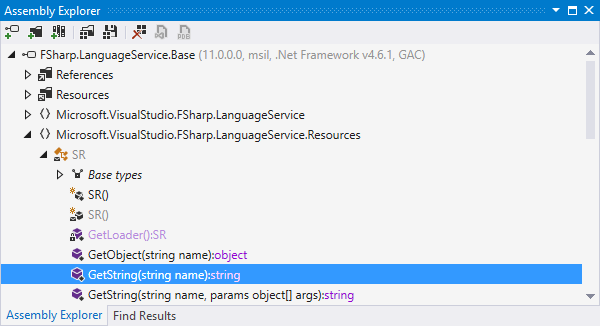 This simple window helps you open compiled assemblies and then use navigation and search commands to traverse and explore them as if you were working with source code. Expanding an assembly node lists namespaces within the assembly, that can be further expanded to types and type members, as well as assembly references.