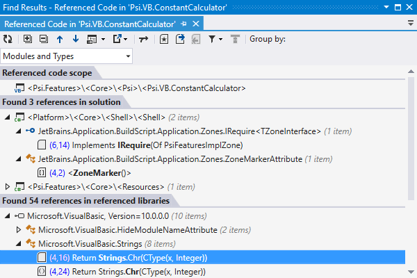 To find dependent or referenced code, select a node in the Solution Explorer or position the caret at a container in the text editor, and choose ReSharper | Find | Find Code Dependent on Module or ReSharper | Find | Find Symbols External to Scope.