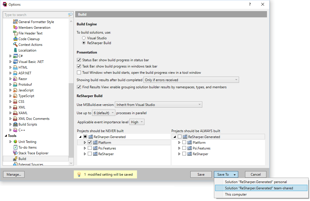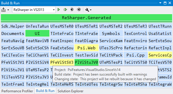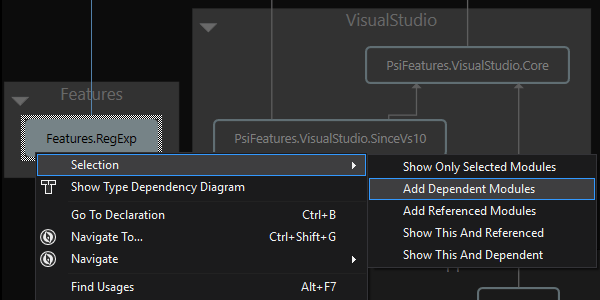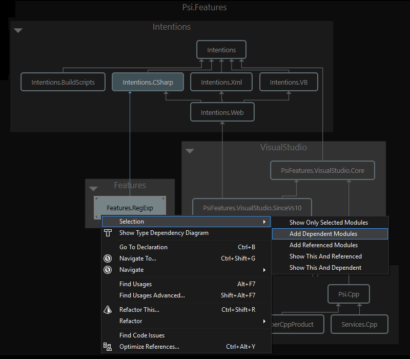 These features include ReSharper Build to optimize the way MSBuild compiles your projects; diagrams that display dependencies between projects or types, as well as a way to find specific code that implement these dependencies; refactorings to optimize references in your solution's projects; and a lot more functionality.