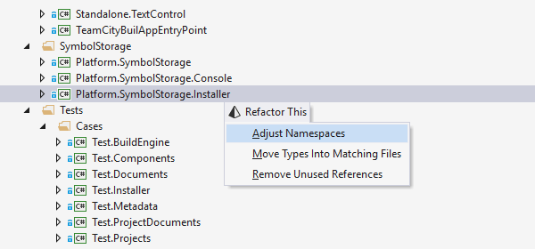 For example, the Adjust Namespaces refactoring helps you synchronize namespaces to folder structure in any scope — as large as your whole solution. That is, if in a certain code file a namespace doesn't correspond to the location of the file in project structure, the namespace is renamed to comply with the file location. All using directives referencing the modified namespaces are updated accordingly.