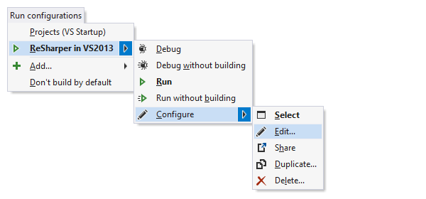 To run or debug the active configuration, which is Visual Studio startup project by default, press Ctrl+F5 or F5. To manage run configurations, press Ctrl+Shift+Alt+R or choose ReSharper | Tools | Run Configurations in the menu.