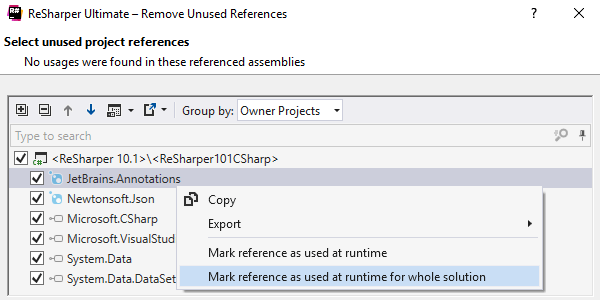 By marking all references that are implicitly loaded, you can safely run ReSharper's Optimize References and Remove Unused References commands without breaking references that are required at runtime.