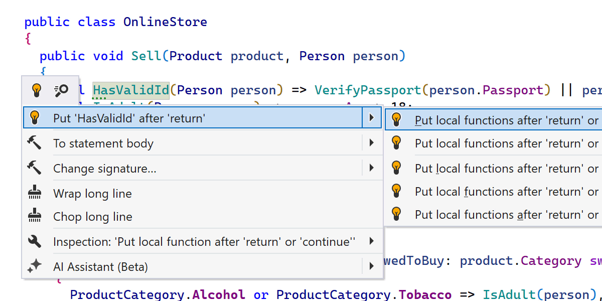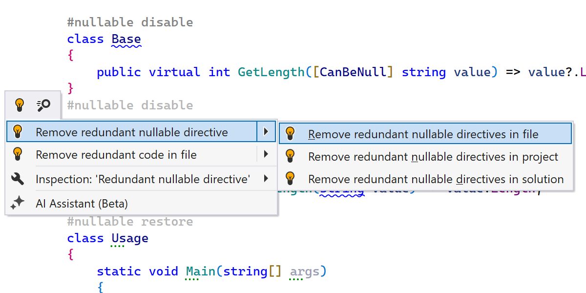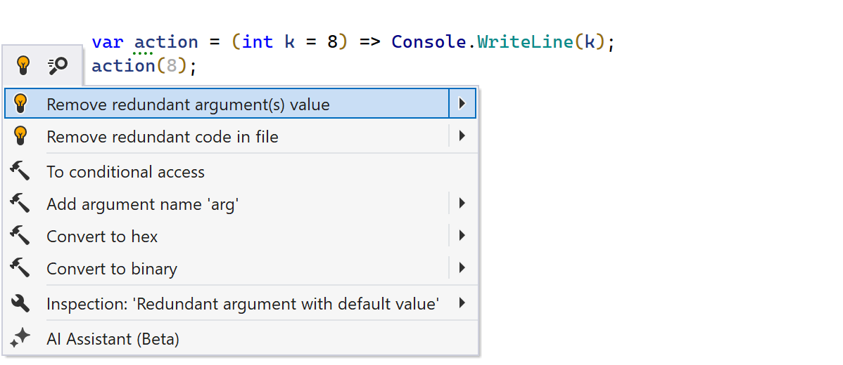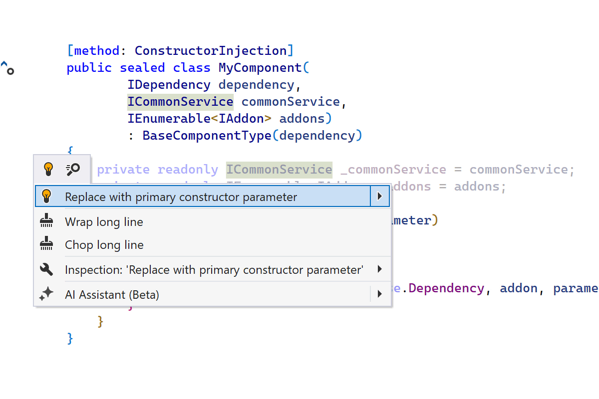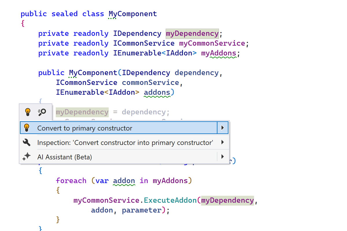 We’ve finalized and refined support of C# 14 extensions, adding support for extension operators, alongside the previously supported methods and properties. Additionally, all the available refactorings, including Change Signature, Convert Method to Property, Make Static, and Safe Delete, have been updated to work with extension members.